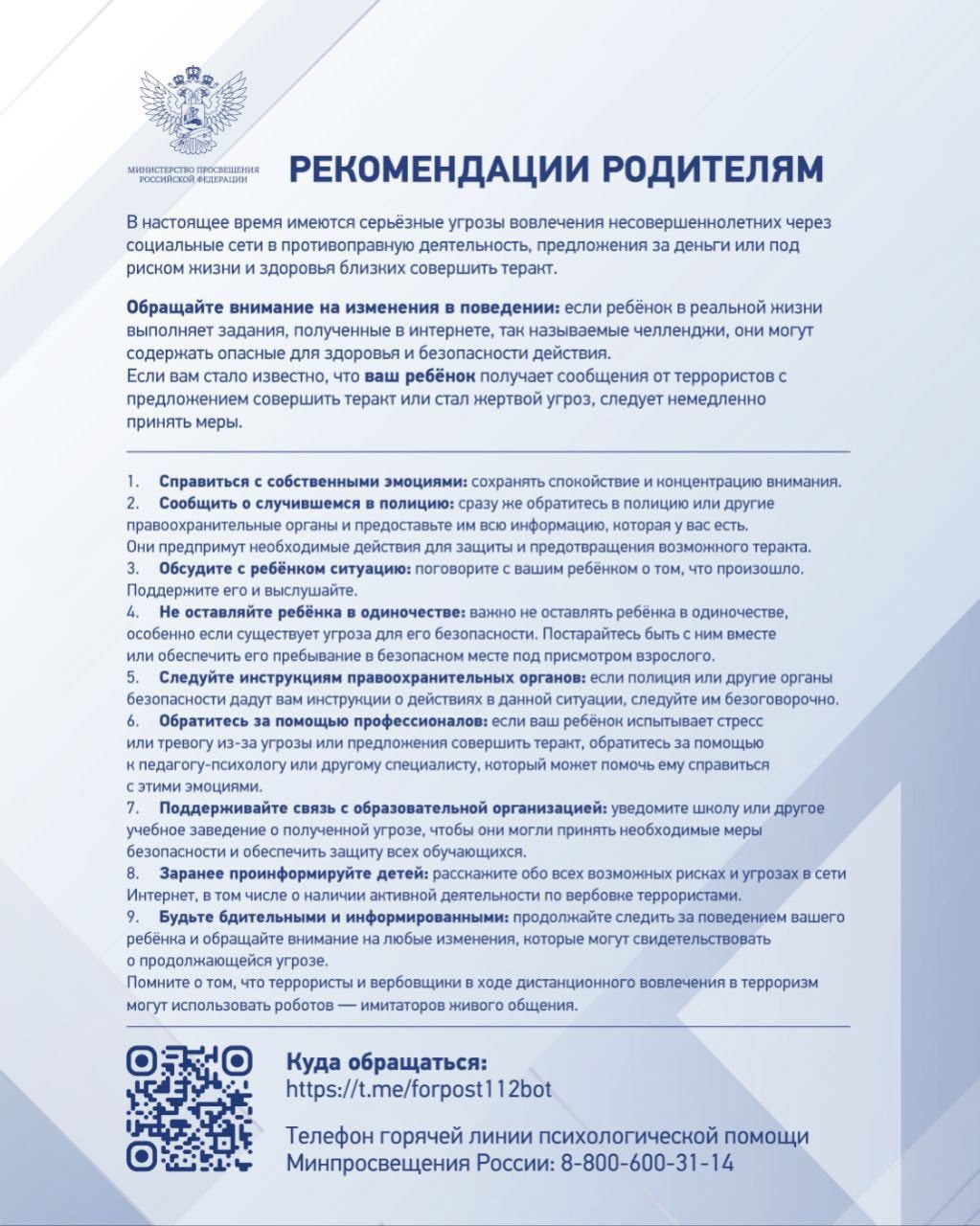 В соответствии с письмом Министерства просвещения Российской Федерации от 27.11.2019 № МР-1546/02 Министерство образования и молодежной политики Свердловской области информирует, что во исполнение подпункта 1.1 паспорта федерального проекта «Поддержка семей, имеющих детей» с 1 сентября 2019 года в информационно-телекоммуникационной сети «Интернет» запущен федеральный портал информационно-просветительской поддержки родителей